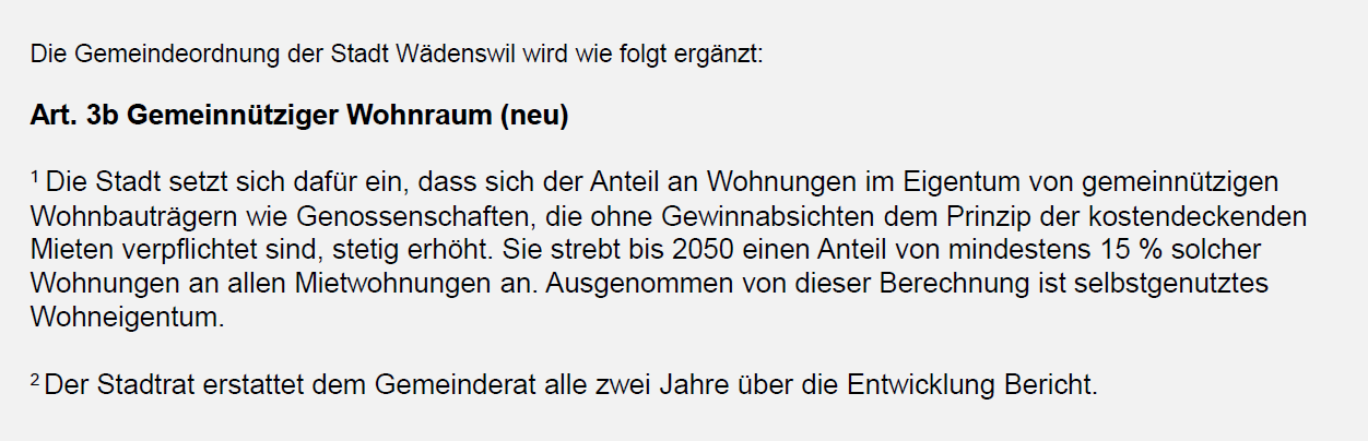 Wädenswil soll eine attraktive Wohn- und Gewerbestadt für die gesamte Bevölkerung sein. Wohnungen nach dem Prinzip der Kostenmiete, wie sie von Baugenossenschaften, der Stadt und anderen gemeinnützigen Trägern angeboten werden, sind deutlich günstiger als vergleichbare Objekte auf dem freien Markt. Deshalb sollen sie gefördert werden, damit Wohnen in Wädenswil für Menschen aller Einkommensstufen erschwinglich bleibt. Da gemeinnützige Bauträger in der Regel ihre Mittel vollständig wieder in die Liegenschaften investieren, werden diese langfristig gut unterhalten und nachhaltig weiterentwickelt.